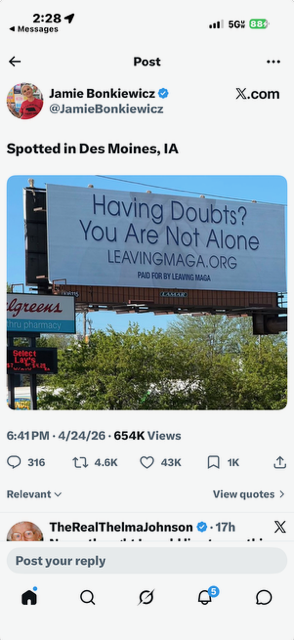 Must-Read Dowd; Fun-Read Hawley; And Look What Got 650,000 Views! Also: The Short, Ridiculous Trial of a Protestor in an Inflatable Penis Costume April 25, 2026 GOES WITHOUT SAYING DEPT. Thank heavens no one was injured last night! Hats off to the Secret Service. MAUREEN DOWD – MUST READ Trump, Iran’s Newest Hostage NOAH HAWLEY – FUN READ What I Learned About Billionaires at Jeff Bezos’s Private Retreat → I’m not sure I fully agree with this (“For the richest men on Earth, everything is free and nothing matters.”). But it’s such a great story. You know the billboards you’ve been helping to fund? This one went up in Des Moines last week: Someone posted it on X, and — as you can see — it’s gotten 650,000 views and 43,000 likes. LeavingMAGA is becoming “a thing.” BONUS The Short, Ridiculous Trial of a Protestor Arrested in an Inflatable Penis Costume